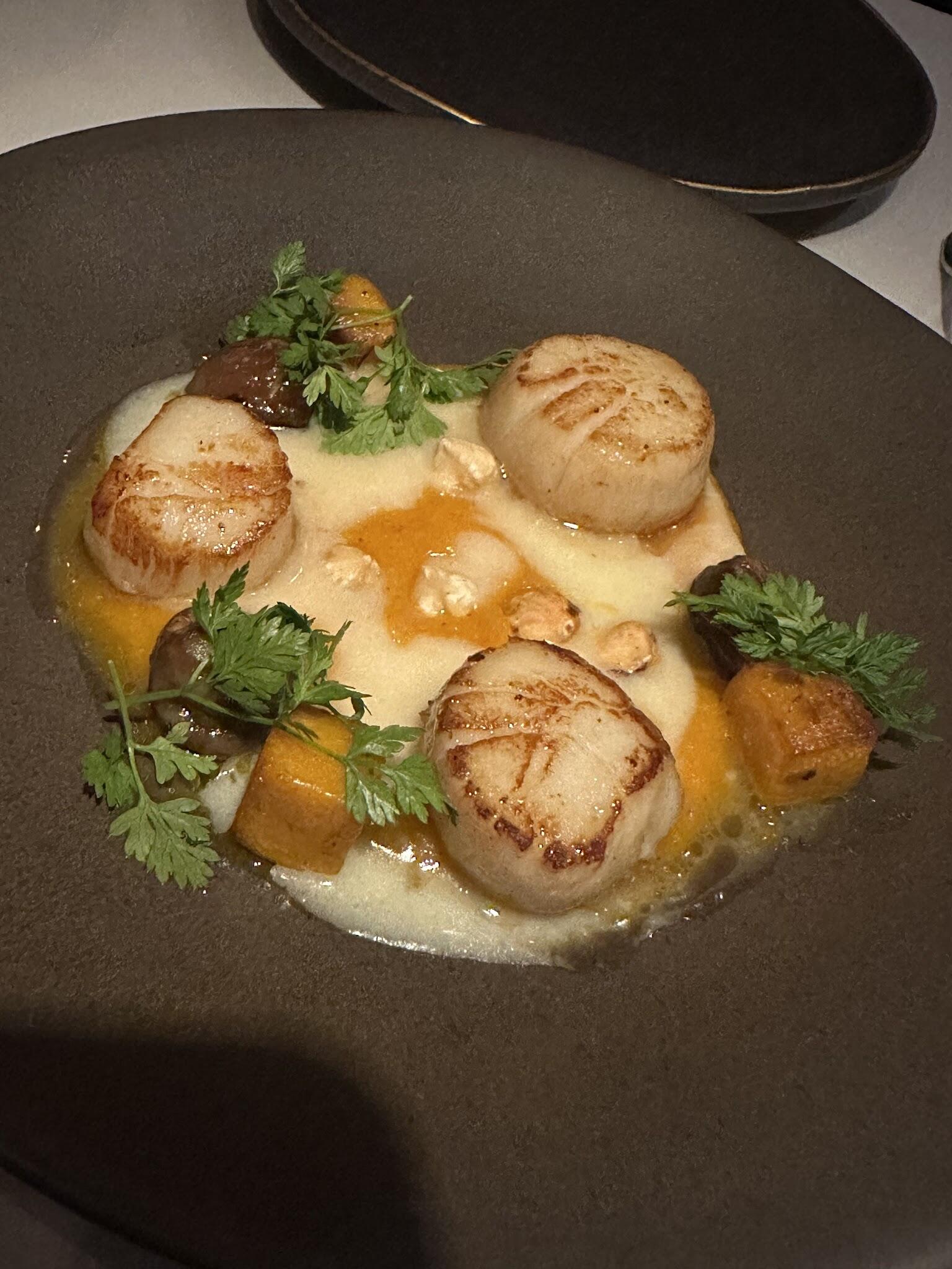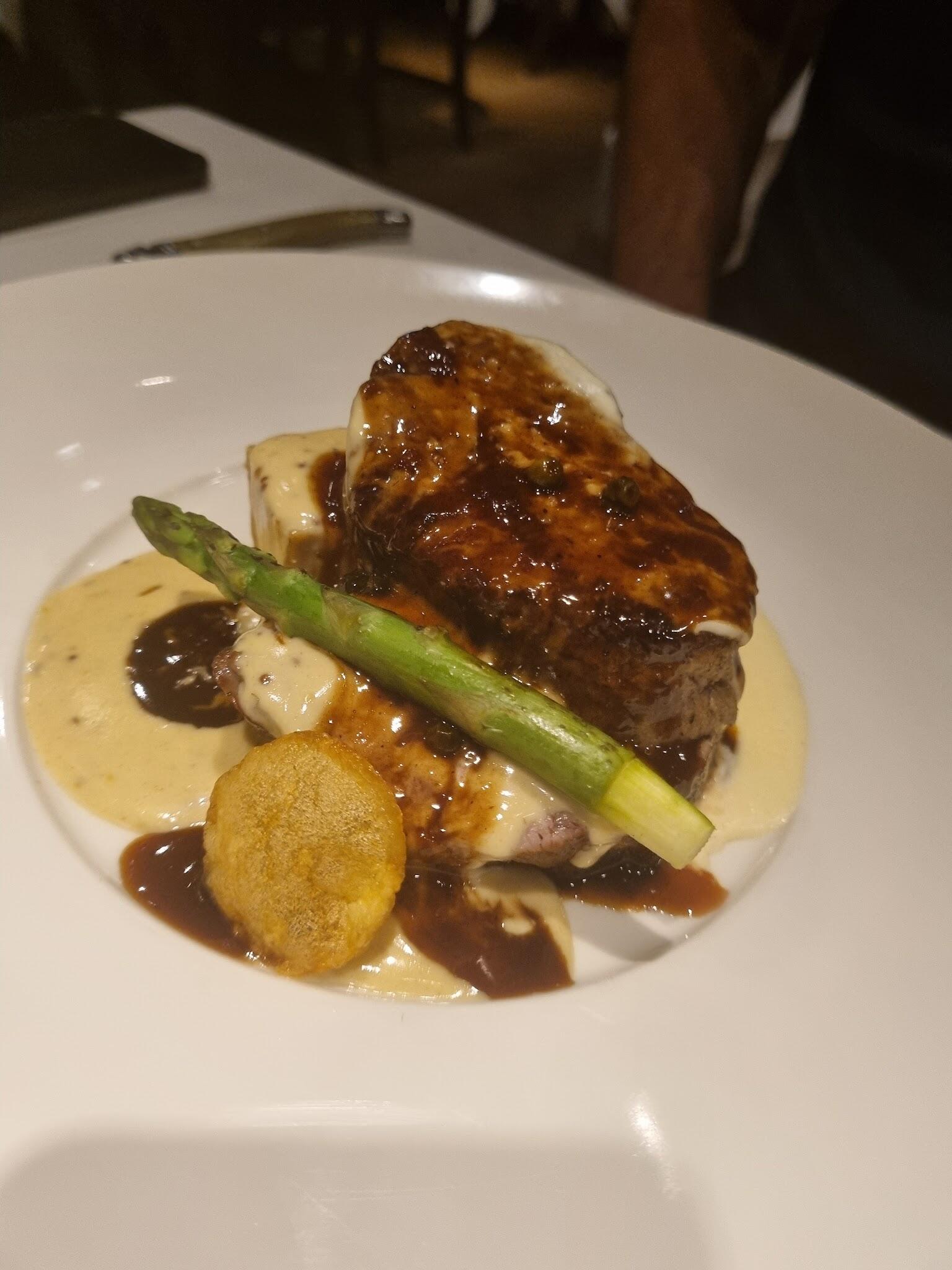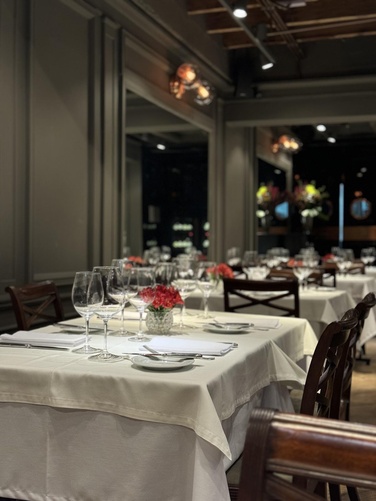 A modern French menu, including shrimp casserole & other meat dishes, served in a classic setting.