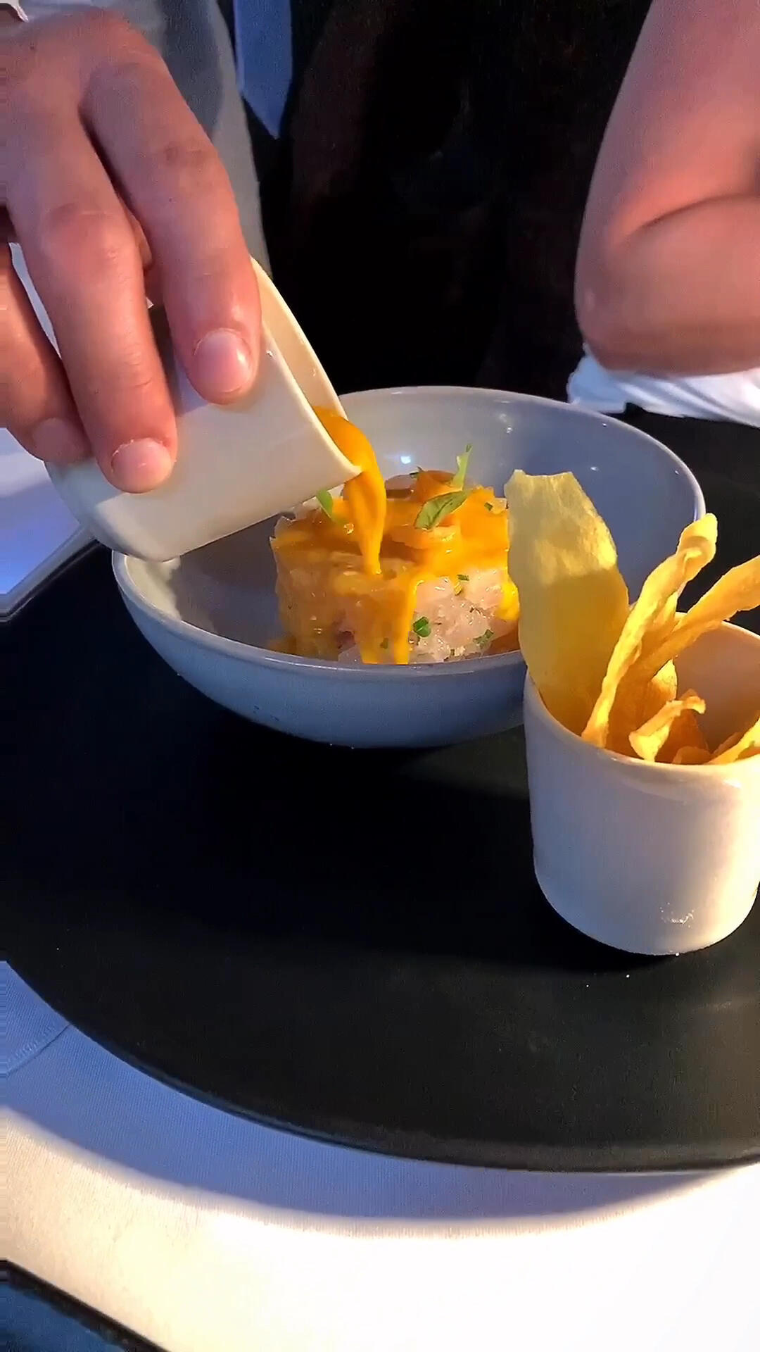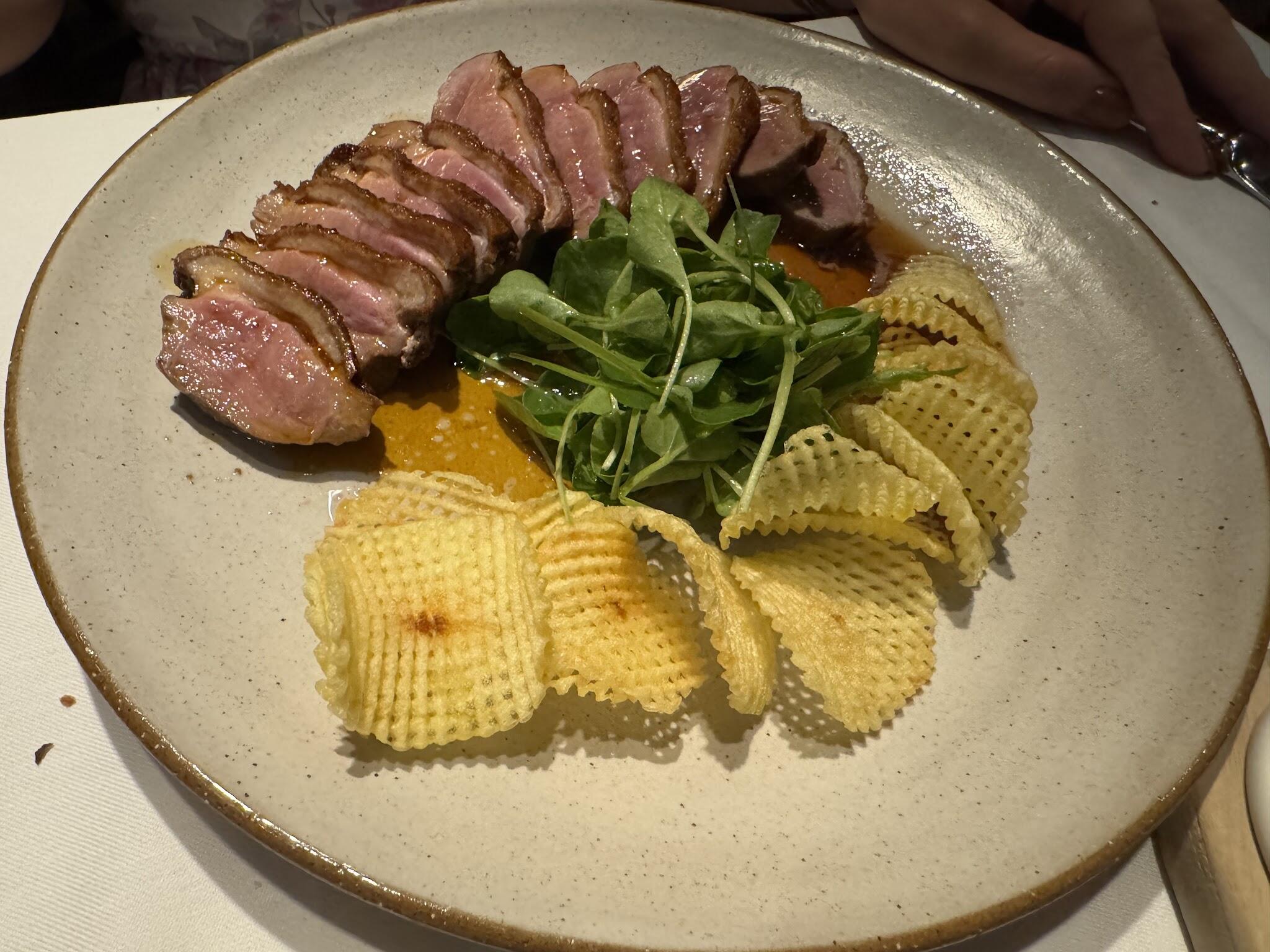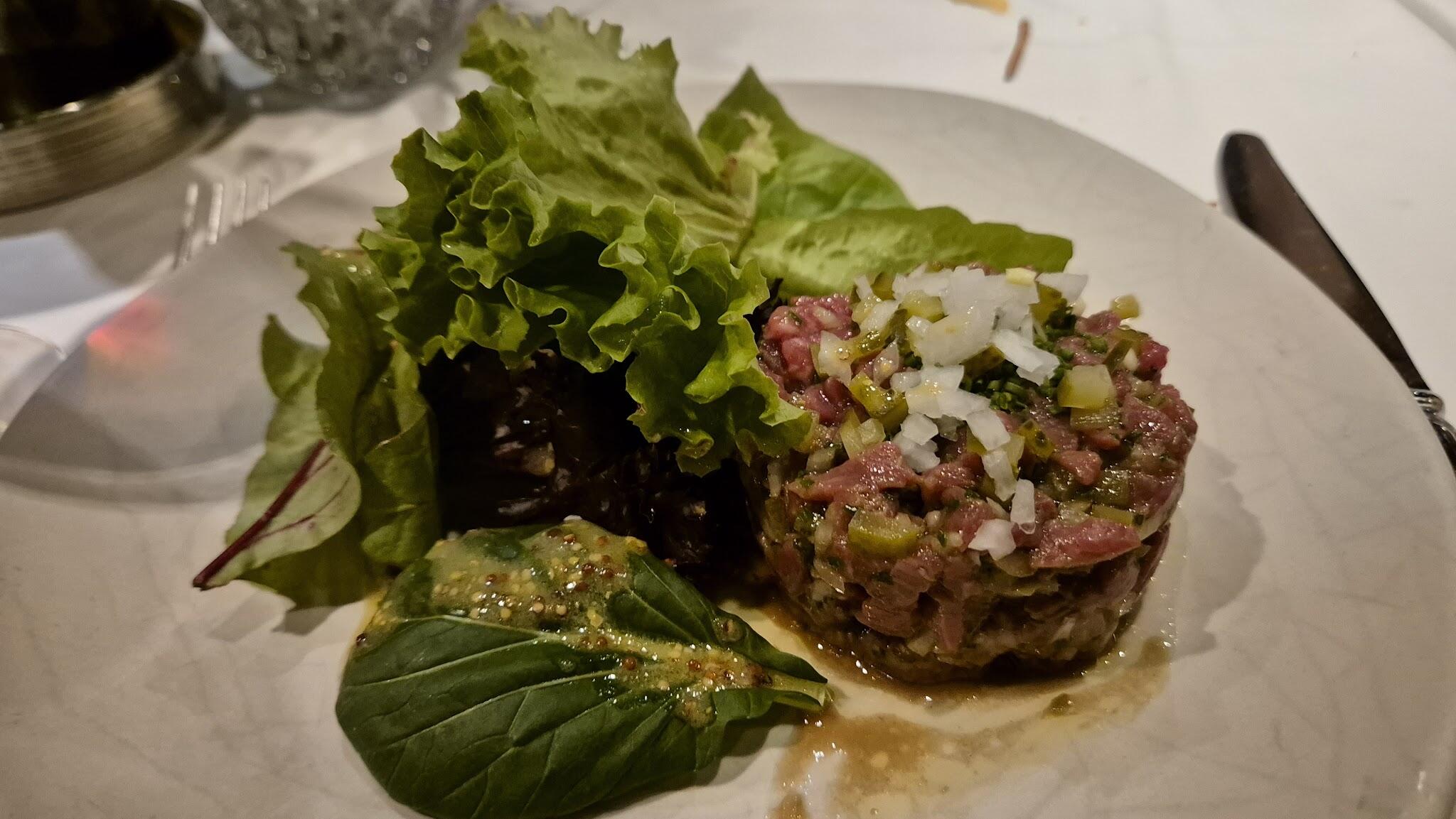 A modern French menu, including shrimp casserole & other meat dishes, served in a classic setting.